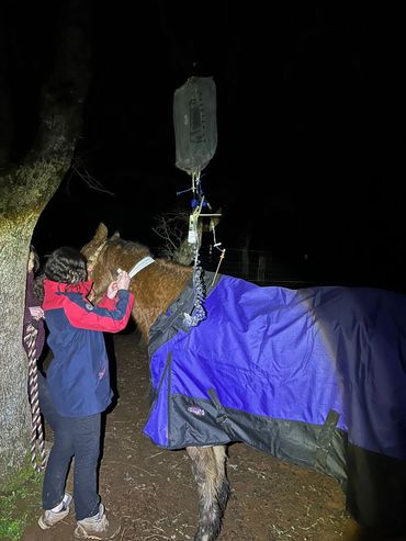 Here attending to Obelis’s field IV set up by the vet. Keeping the horse in place and calm for several hours.